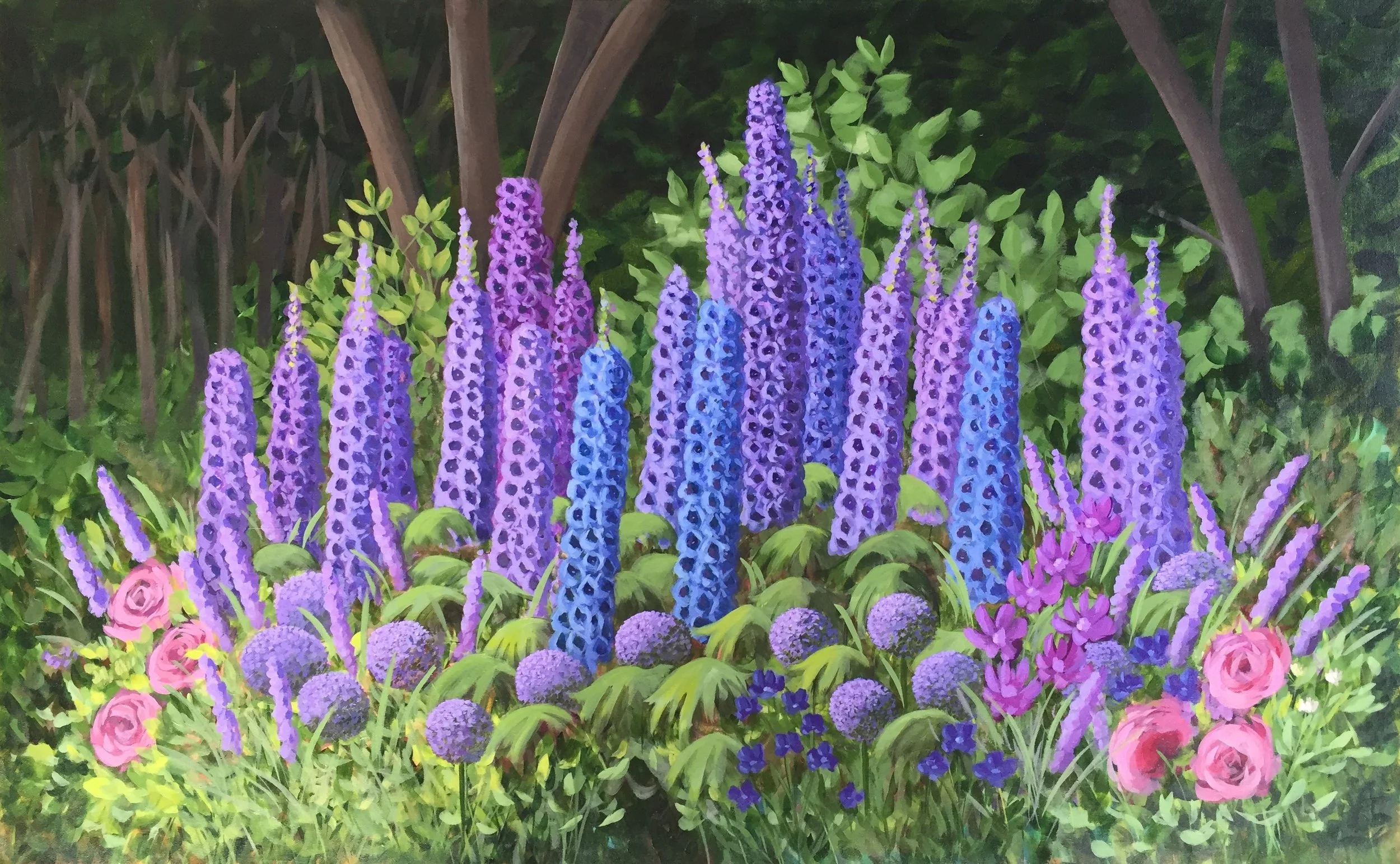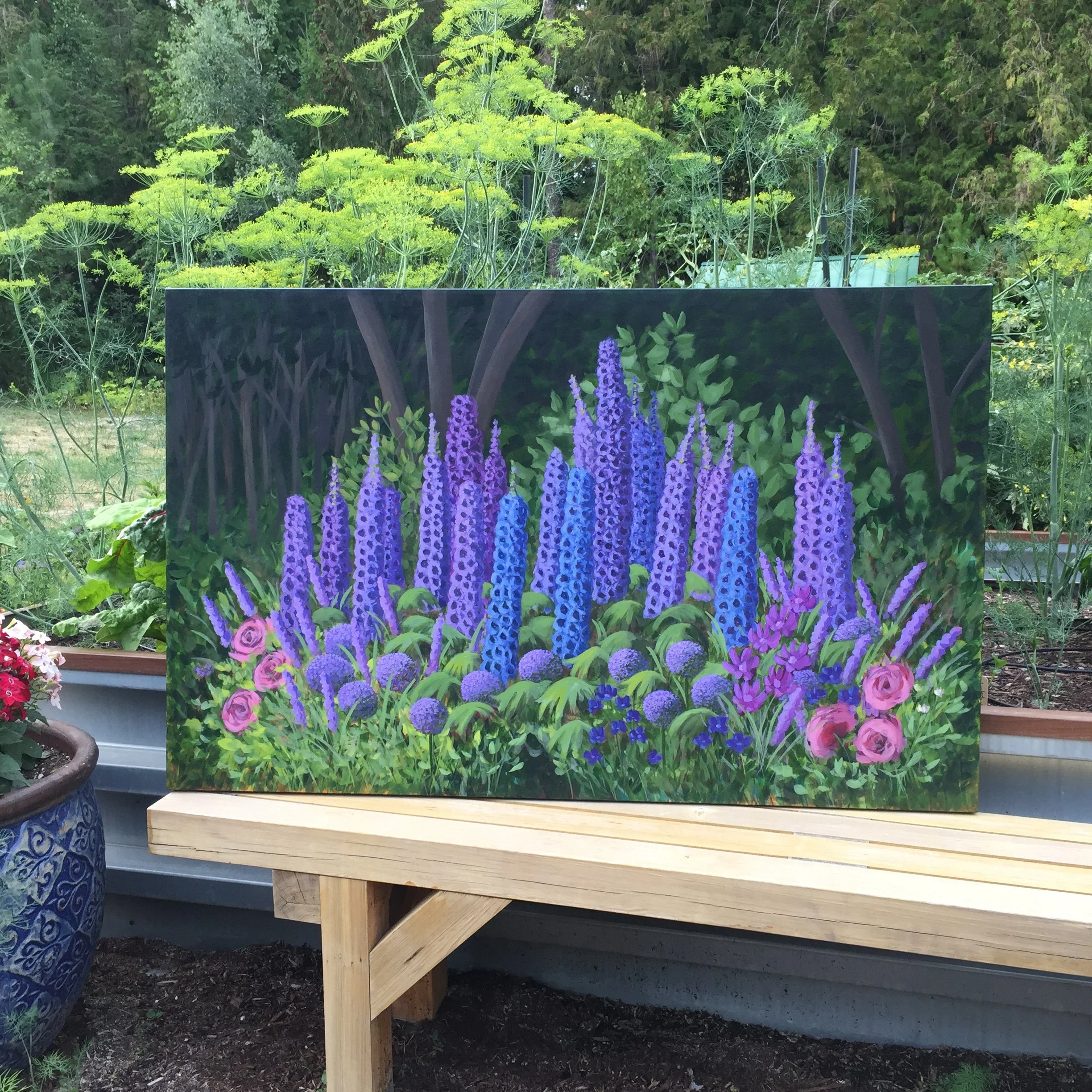 Delphiniums are lovely. But I am always so disappointed how the flowers only last for such a short time. Each year I have plans of painting the delphiniums in my garden, but the time always seems to slide by before I get to it! This winter I spent many hours painting these big, bold and beautiful stocks in varying colours of purple and blue. I love the contrast of the bright flowers against the dark forest in the background. With this painting in your home, spring and delphiniums would last all year long.