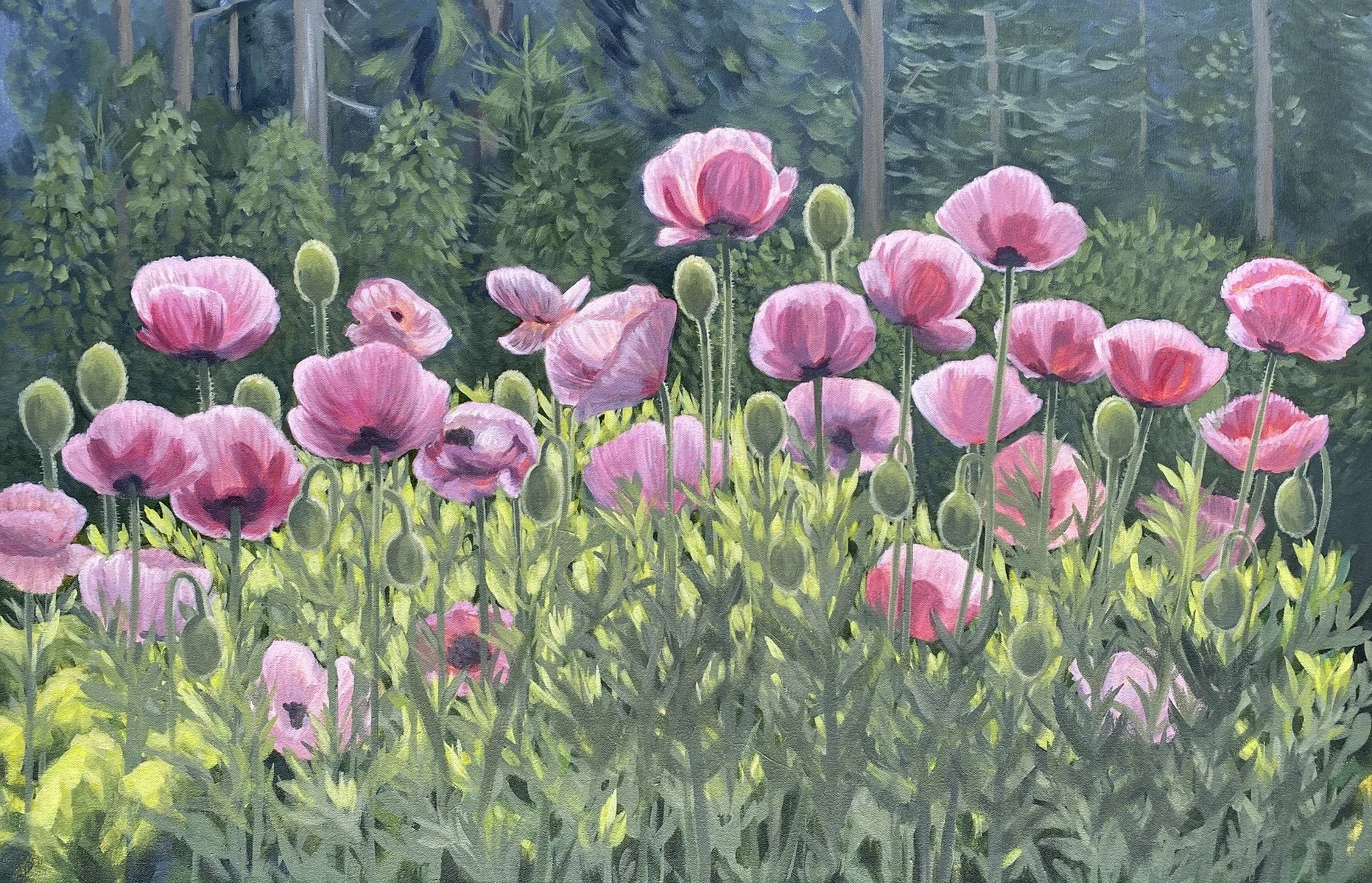 I took this reference photo early one summer morning as the sun came over the trees and hit the garden. The poppies were aglow with promise and sunshine. Later in the fall I spread the seeds from these poppies around my garden hoping for more glowing poppies next spring.