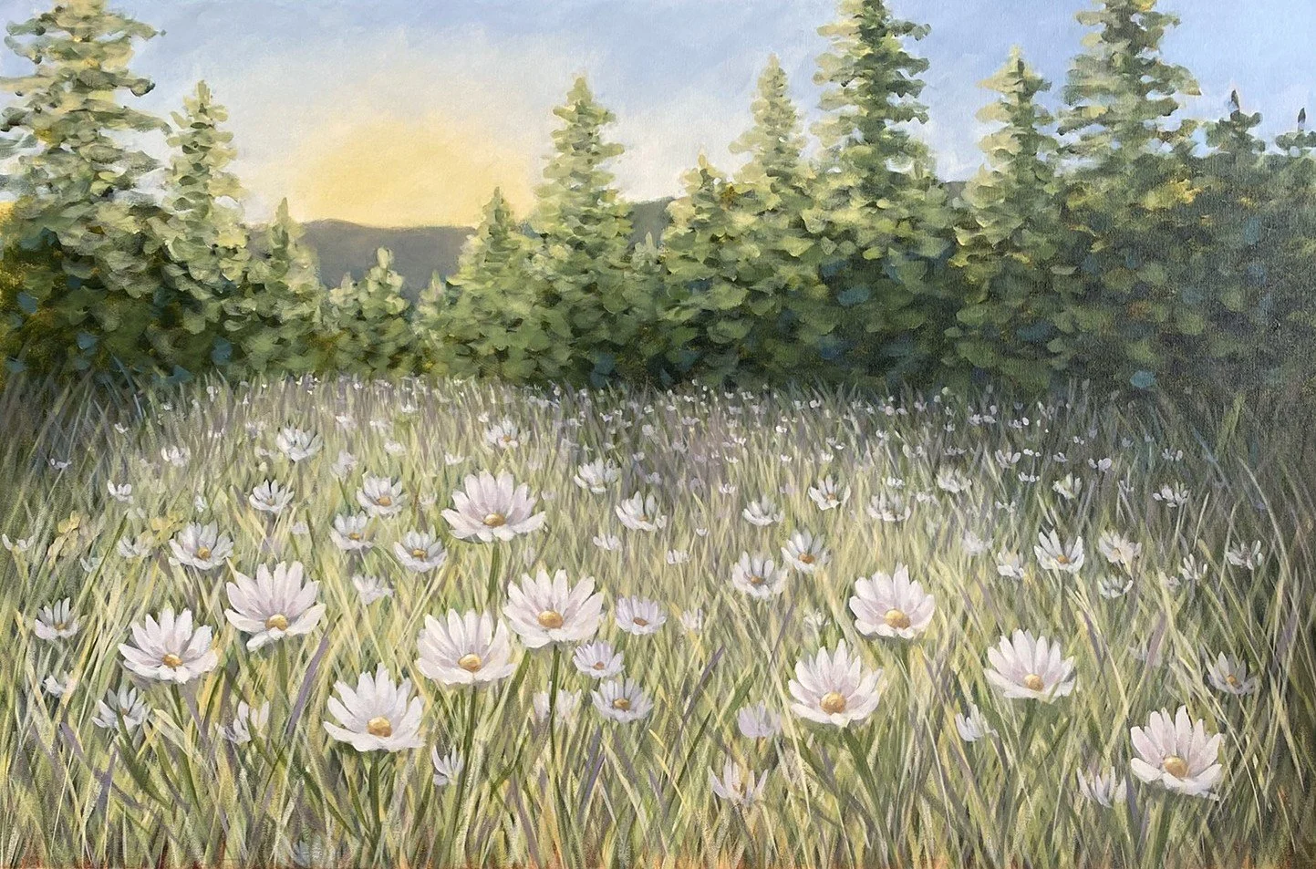This is a view of our yard in the spring facing West towards Deep Creek Valley. If we get enough rain in the spring, we have a lovely border of daisies around the edge of the yard. This painting gives me a sense of calm. While looking at it, I find myself slowing down and taking big calming breathes. It gives me a sense of peace and tranquility.